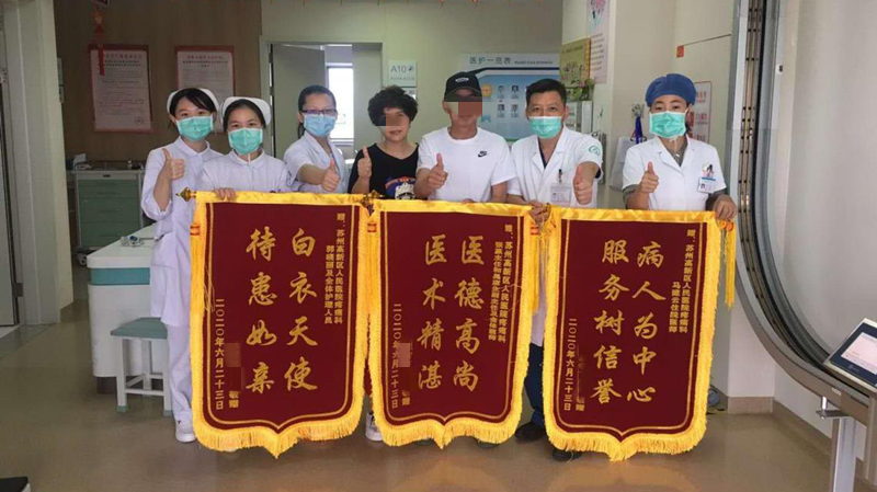 端午节前夕,还没等科室大查房,50岁的卞叔叔就在家属的陪同下来到了疼痛科医生办公室,并高兴地给他们献上了一份大礼——上面书有“医德高尚、医术精湛”“白衣天使、待患如亲”“病人为中心、服务树信誉”字样的三面锦旗。