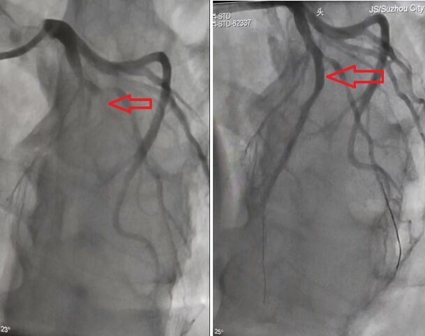 在履行完签字后,在张孝忠主任带领下,全科医护人员通力配合,手术顺利成功,在闭塞的左前降支植入三枚支架,开通了闭塞血管,手术用时仅四十八分钟。术后,患者胸痛好转,生命体征平稳,送回CCU继续恢复治疗,复查心电图提示前壁导联ST段抬高回落,正在康复中。